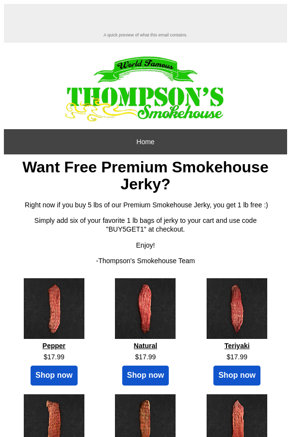 Buy 5 lbs of Premium Smokehouse Jerky, get 1 lb free. Add six 1 lb bags to cart and use code BUY5GET1 at checkout. — Promo code: BUY5GET1