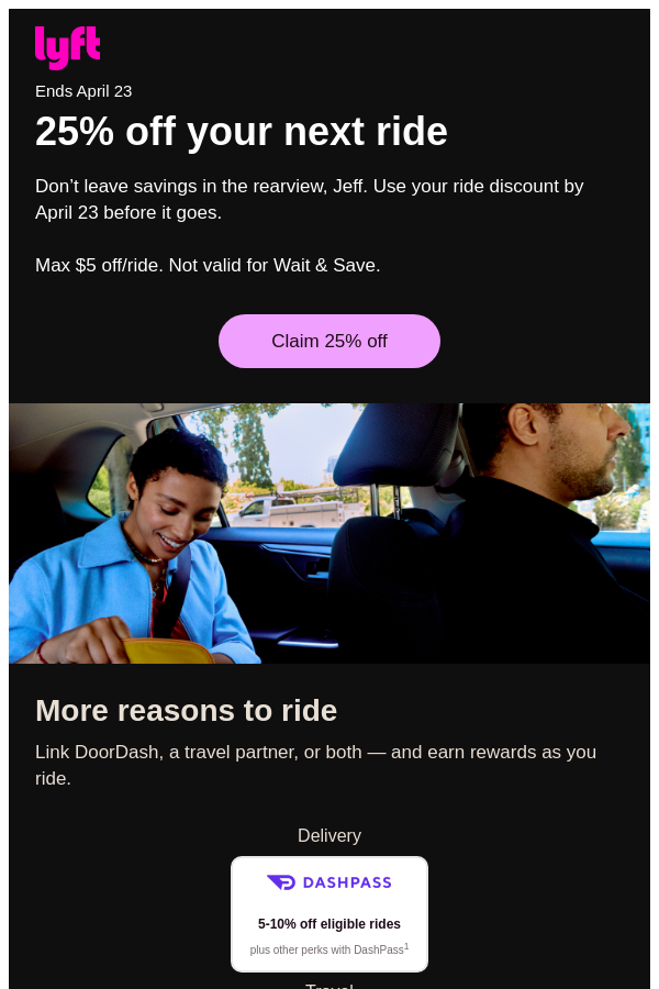 25% off your next ride with maximum savings of $5 per ride. Not valid for Wait & Save rides.