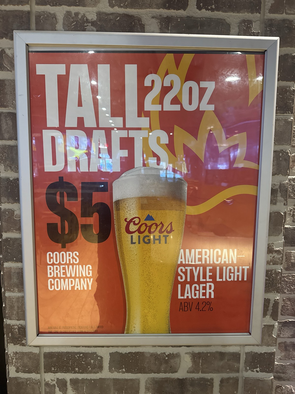 $5 tall drafts (22oz) of Coors Light American-style light lager