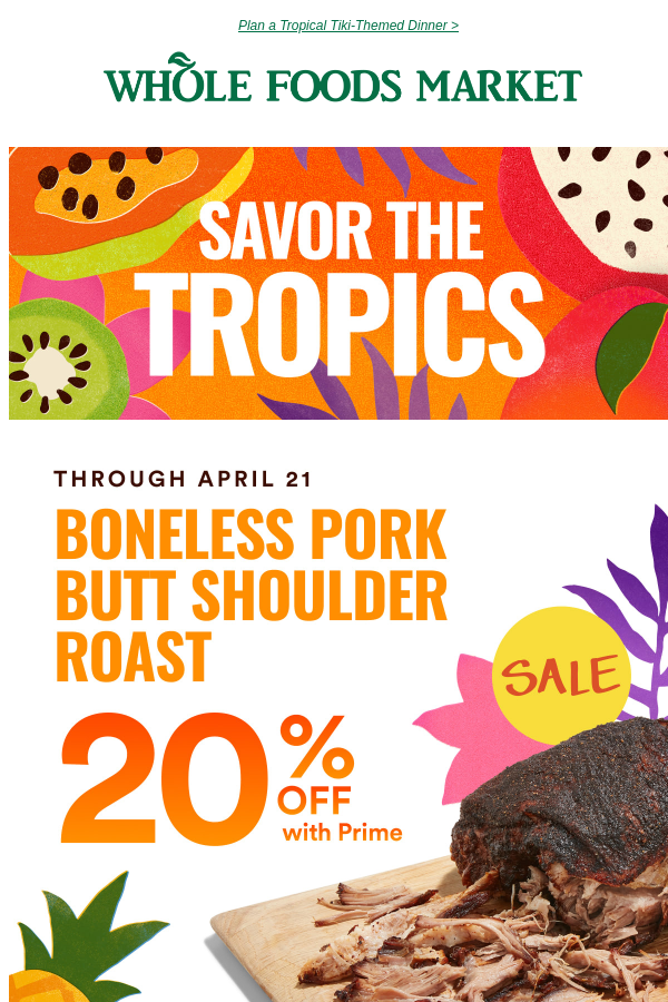 20% off Boneless Pork Butt Shoulder Roast with Prime membership, up to 25% off select tropical fruits, 25% off Hot Large Spicy Hawaiian Pizza with Prime, and 30% off select Seventh Generation products with Prime