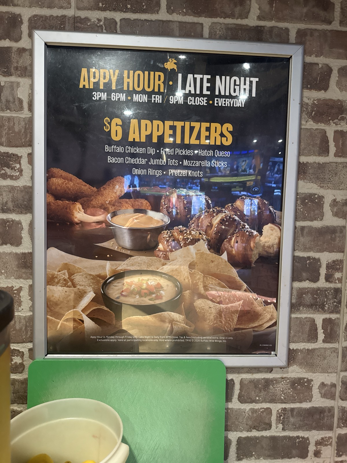 Happy Hour: 3PM-6PM Mon-Fri, $6 appetizers including Buffalo Chicken Dip, Fried Pickles, Hatch Queso, Bacon Cheddar, Jumbo Tots, Mozzarella Sticks, Onion Rings, Pretzel Knots. Late Night: 9PM-Close everyday with same $6 appetizer deal