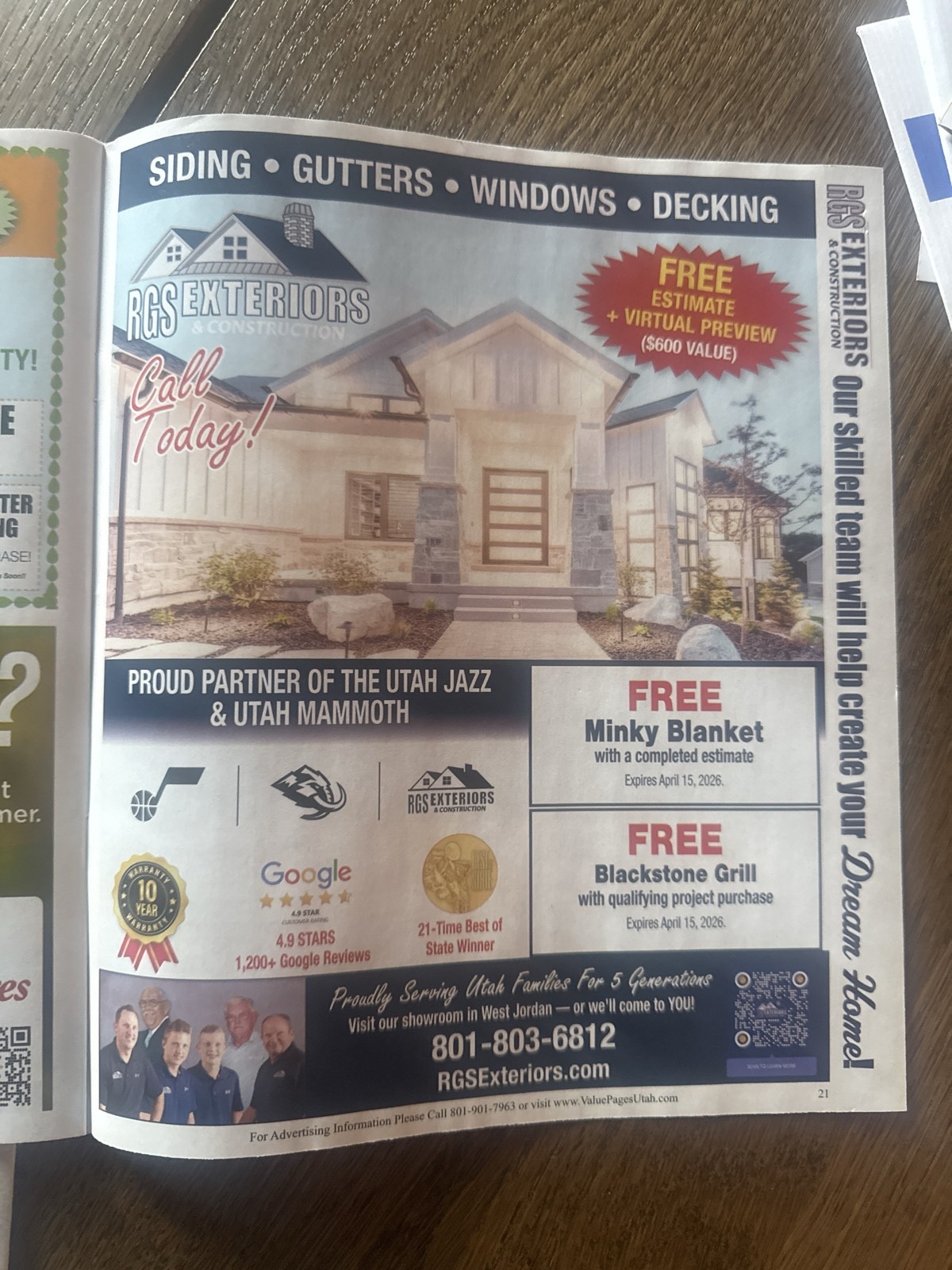 Free estimate + virtual preview ($600 value), Free Minky Blanket with completed estimate (expires April 15, 2026), Free Blackstone Grill with qualifying project purchase (expires April 15, 2026)